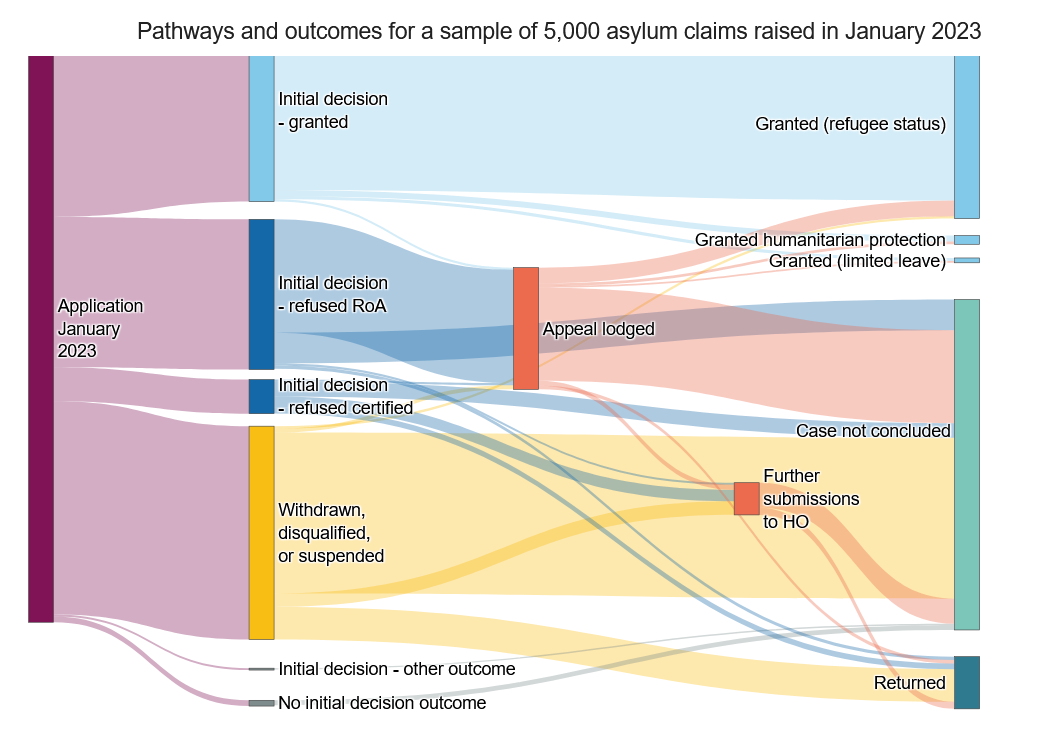 I recommend scrolling through this incredibly useful data visualisation page, which the report describes as representing “visually the relationships and interactions across departmental and organisational boundaries in managing asylum.” I found it particularly useful to look at how cases have been moved from the initial decision backlog into the appeals backlog. There is also a section looking at asylum accommodation. The below graphic looks at what happened to 5,000 people as they moved through the asylum system: