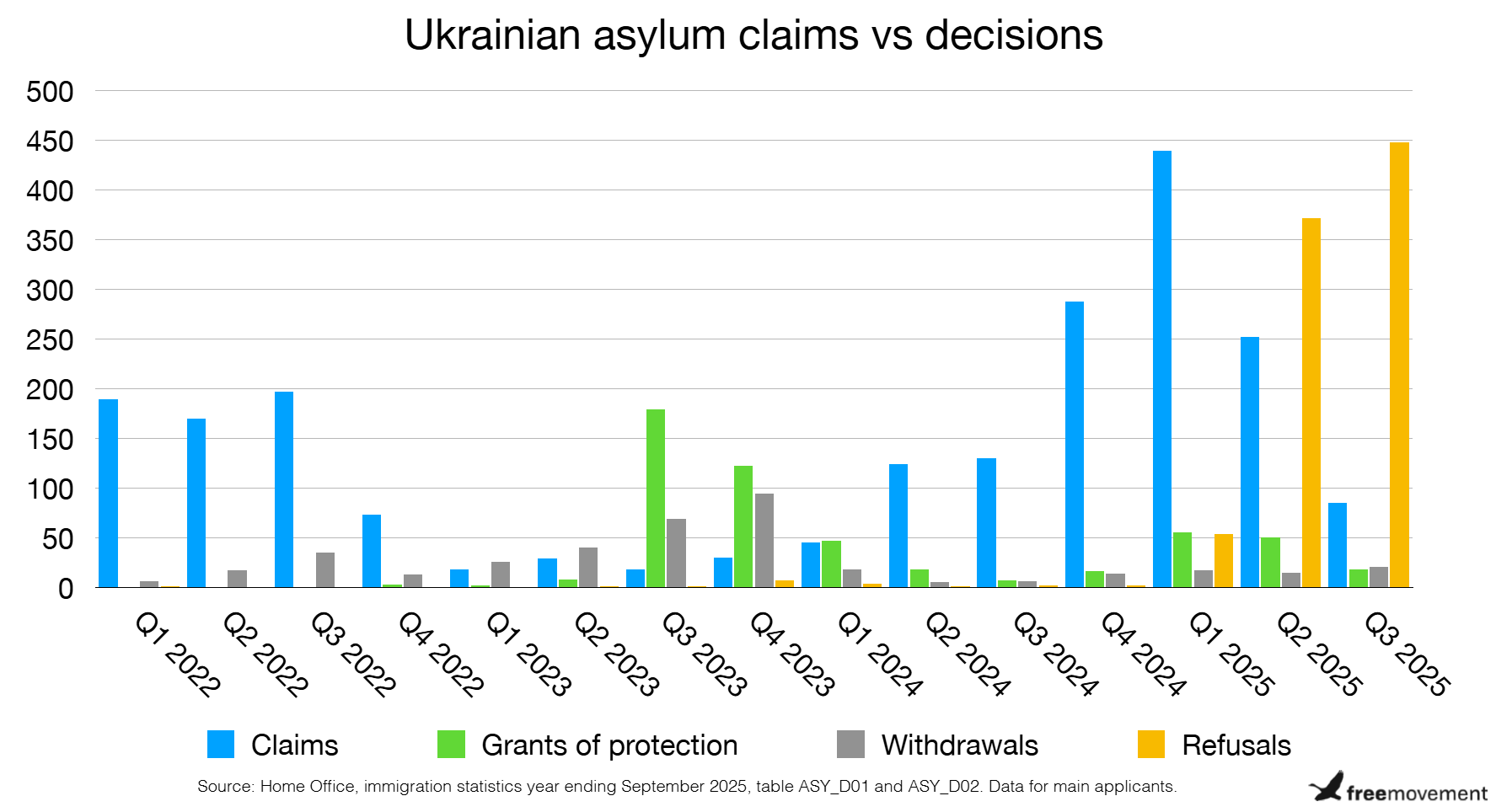 From the beginning of 2022 until the end of June 2025 there have been 1,949 asylum claims made by Ukrainian nationals (as the main applicant, the figure including dependants is higher). 1,027 of those claims were made in the 12 month period ending June 2025.